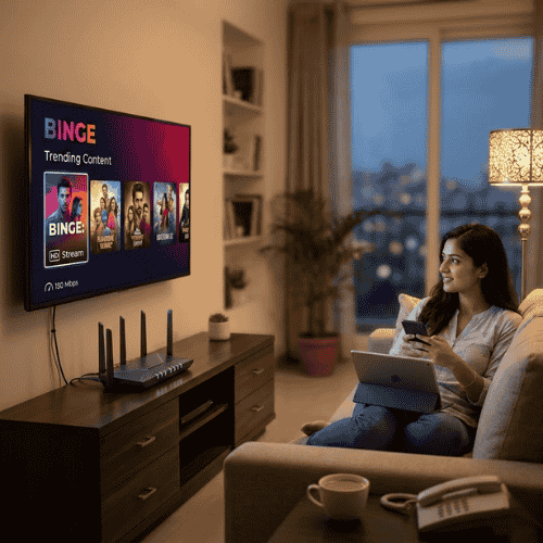 Binge 150 is a high-performance monthly plan offering 150 Mbps high-speed Wi-Fi, OTT entertainment, and voice calling in one package. Enjoy buffer-free streaming, fast downloads, and reliable connectivity for work and entertainment.