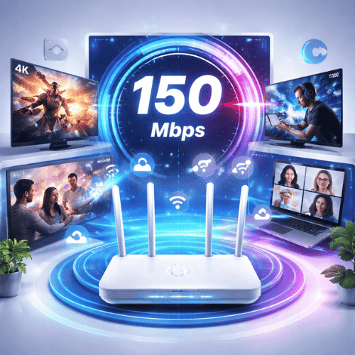 The GTPL-KCBPL WiFi Package – Boost 150 Mbps is a premium high-speed broadband plan built for heavy internet usage and smart homes. With speeds up to 150 Mbps, this package ensures ultra-fast downloads, seamless 4K streaming, lag-free online gaming, and crystal-clear video conferencing. It easily supports multiple users and devices at the same time, making it ideal for large families, remote professionals, students, and digital content creators. Powered by advanced fiber connectivity, the Boost 150 Mbps plan delivers stable performance, low latency, and minimal buffering even during peak hours. Whether for work, entertainment, or cloud-based tasks, this plan offers powerful and dependable internet to keep your digital lifestyle running smoothly.